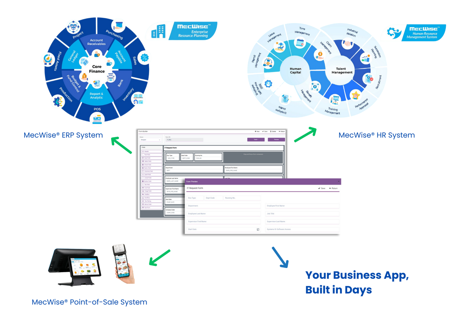 This isn't just another tool. The MecWise® Low Code No Code Platform is the enterprise-grade engine we use as the foundation for our own flagship ERP, HR and Point-of-Sale systems.