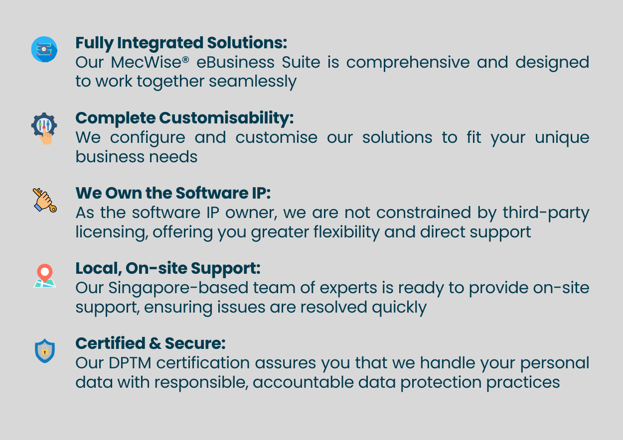 Stop juggling disconnected tools. Our fully integrated MecWise® eBusiness Suite brings your entire operation -from payments and custom apps to core ERP and HR - onto a single, powerful platform designed to overcome the hurdles of regional expansion.