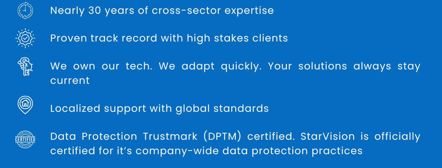 Building custom solutions requires a reliable platform and a trusted partner. StarVision has delivered enterprise solutions for nearly 30 years.