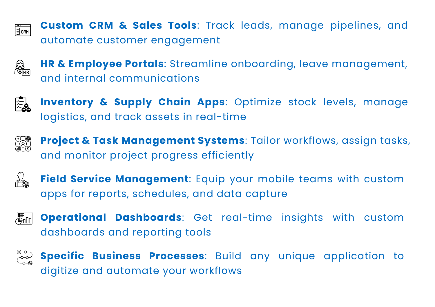 Almost anything for business operations. From custom CRM, HR portals, inventory management, and project tools to field service apps and unique operational dashboards.