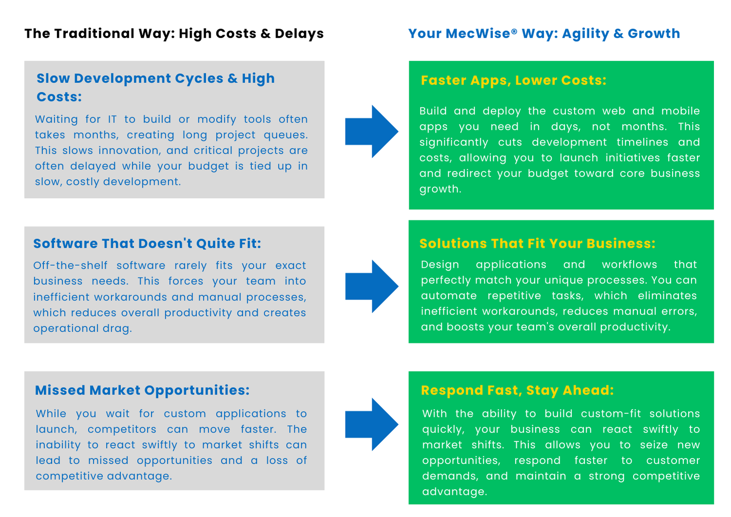 MecWise® Low Code No Code changes the equation. We provide the platform to build what you need, when you need it.